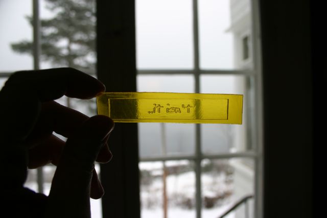 When I work with text or drawings (either hand-drawn or computer generated), I need to go through a variety of steps to move them from the 2 dimensional world on my computer or piece of paper, to a 3 dimensional format that I can use to create the mold the the jewelry I create. One of these techniques is using photopolymers. Photopolymer plates are available in a variety of formats (different thicknesses, different backings ie. metal or plastic) I use a variety of depths, dependent on the project at hand. The plate material is UV photosensitive and when exposed to an ultraviolet light through a high contrast negative, the U.V. cross links the polymers and hardens the image.  It is really quite simple 😉