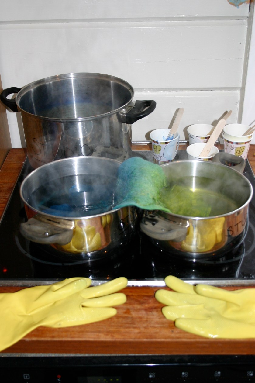 Another productive day in the studio (and it is not even noon!). FeltUnited as many of you know is fast approaching (at least for Elis and I). There are a series of projects ongoing in the studio (well mostly in my head for now) that require some preplanning .. ie dyeing fibre.